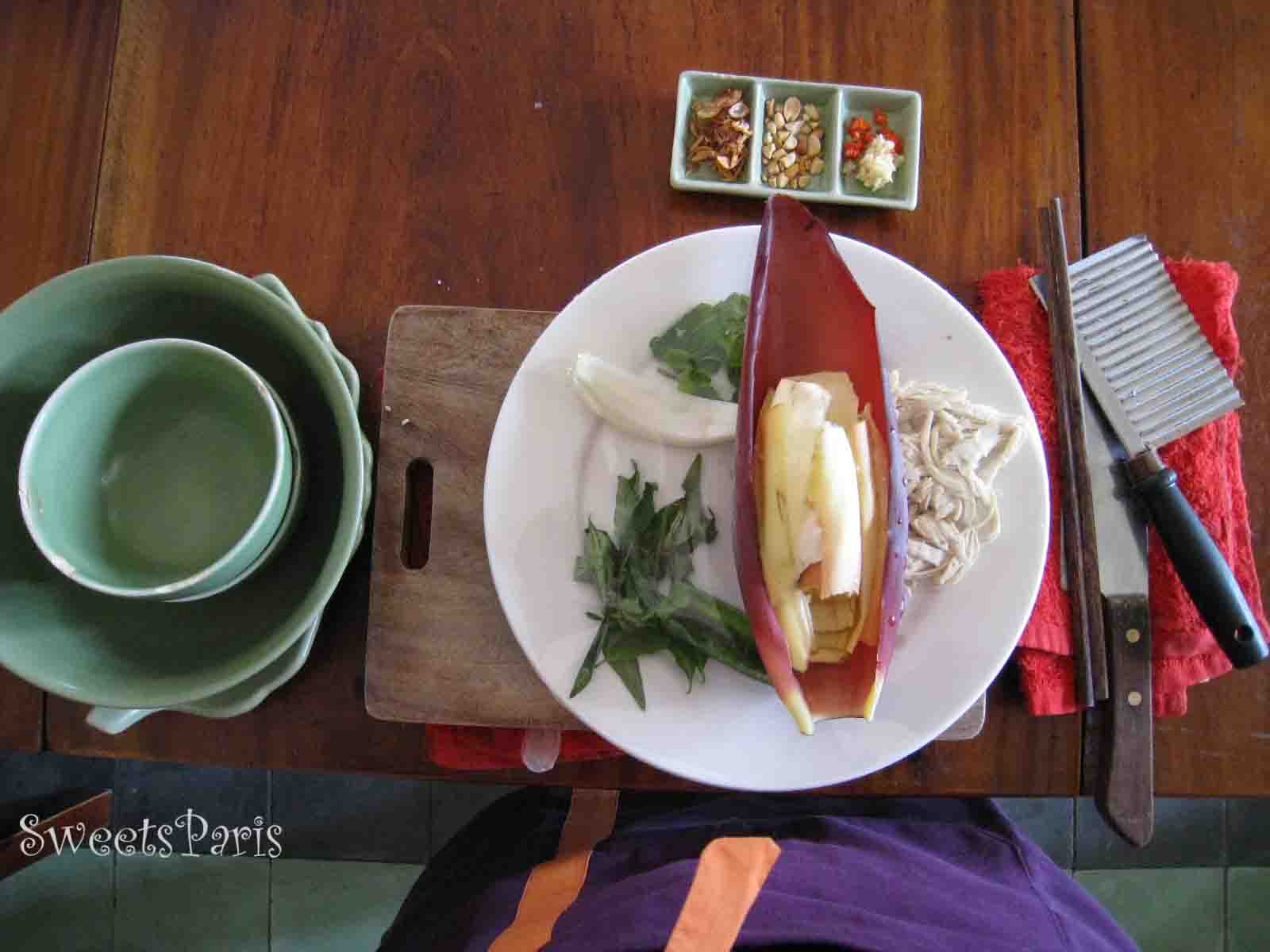 次に作るのは、2品目の鶏肉とバナナの花のサラダ(Salade de fleur de bananier au poulet)です。